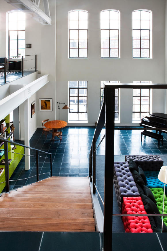My love affair with New York firm Selldorf Architects continues. A vast, lofty, wide open, light streaming in, killer industrial windows type of lovin’. Stark white expanses anchored by dark floors and warmed by wood and colour blocks. And the whole idea of descending down into a TV “pit” just makes me grin like an idiot. Great bones brought to life with great design.