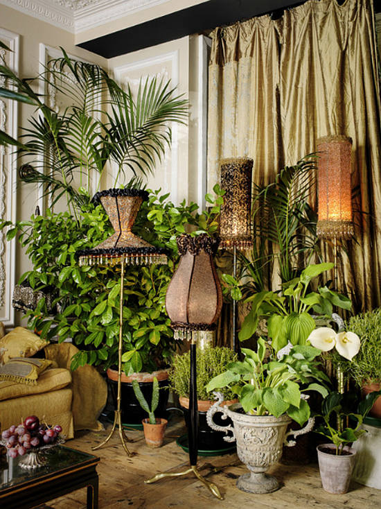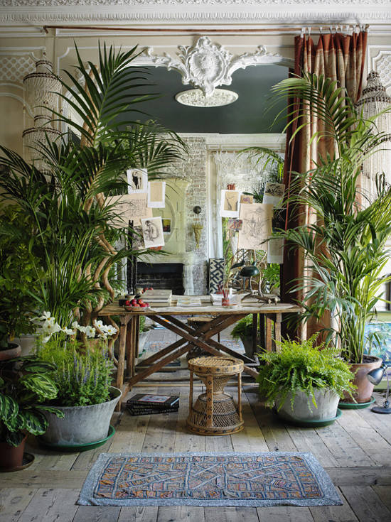 Over the years Kim and I have been fascinated by the homes of Sera Hersham-Loftus or should I say the reinvention of her homes. The queen of the boudoir look with its seductive, glamorous and over-the-top trappings is also the queen of the quick change, of reinvigorating her glorious spaces. Kim last featured her house a year ago but when I recently visited the Sera of London website, voila, her house had evolved into a glamazon jungle with the addition of even more houseplants than her usual parlour palms. It’s spring, only it’s inside. I love the look but can you imagine watering day?!