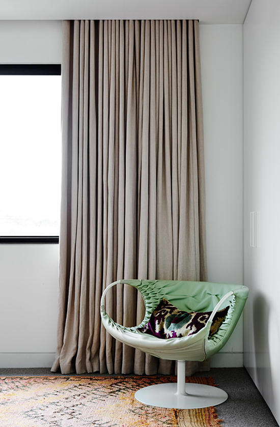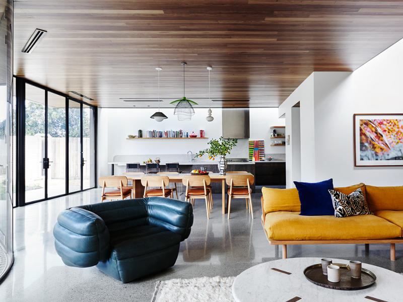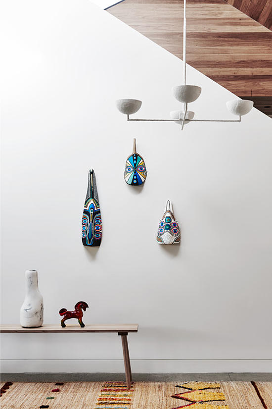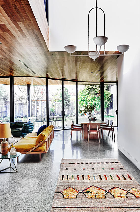 A modern addition to an Art Deco home by Folk Architects has been brought to life by Sydney-based design studio Amber Road. What could have read as disparate spaces now references deco elements through colour, texture and a bespoke light fitting in the entrance. A thoroughly stylish family home.