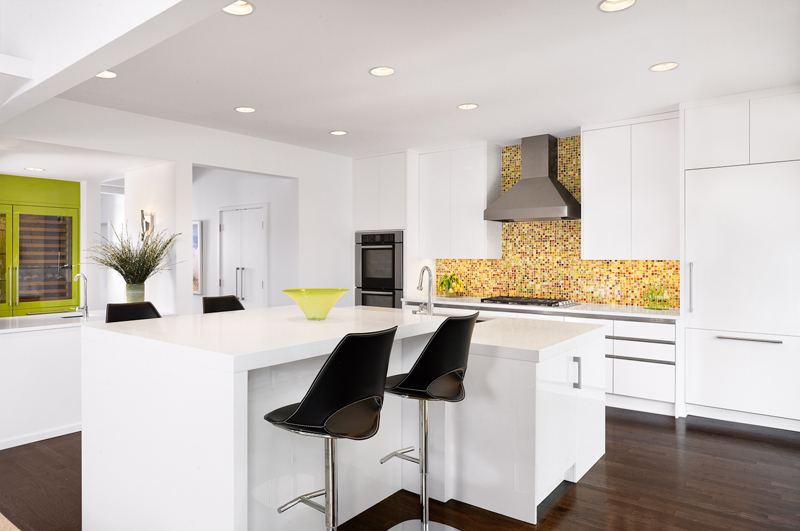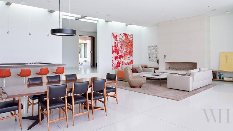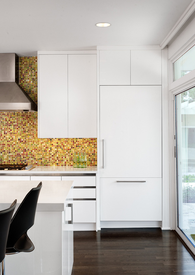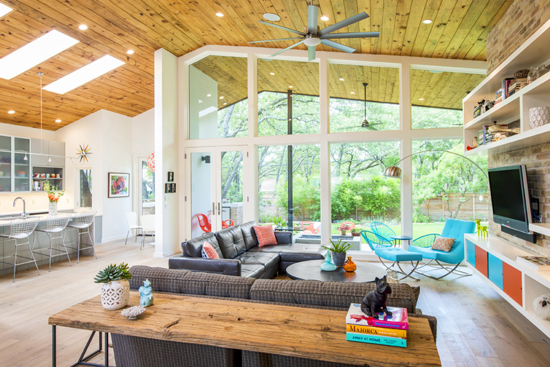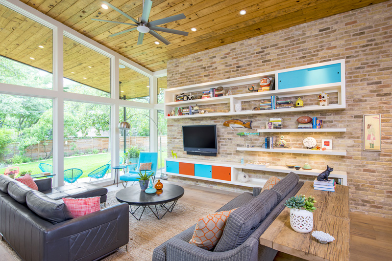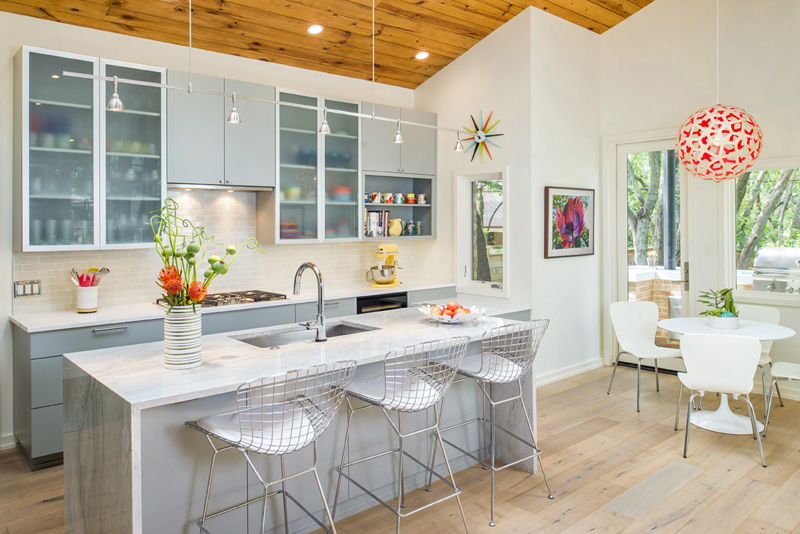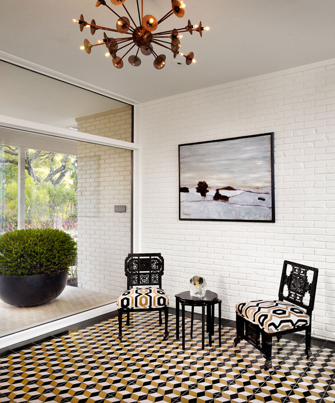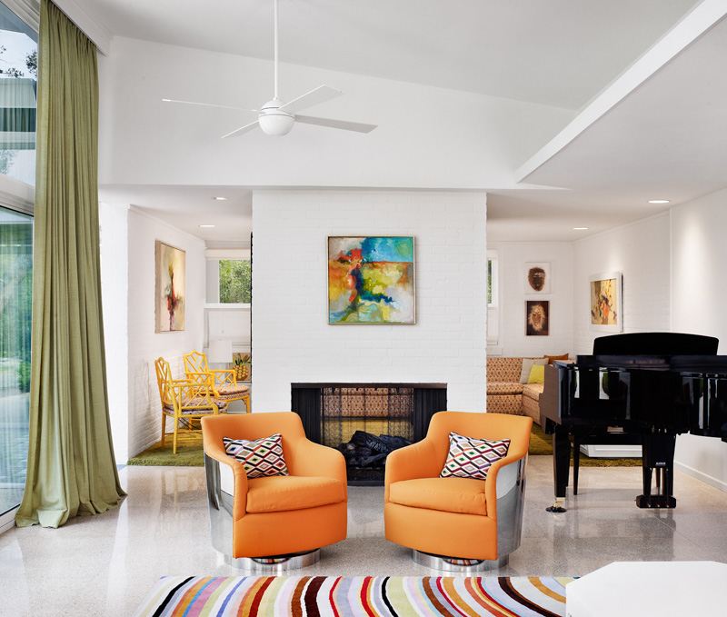 I recently discovered interior designer Holly Hickey Moore‘s work and I love her style. She is focused on creating vibrant, layered, and eclectic interiors. With every project, she strives to design a timeless living environment with multi-generational appeal. She is edgy (and a little rebellious), designing spaces that are complex and unique, yet intuitive and comfortable. She primarily works in New England and Texas but is looking to branch out to New Zealand (where her husband is from) and Australia (perhaps I could convince her she needs me as an assistant ;)). This home in particular I really like for its funky midcentury modern/retro vibe. To complement the architecture, the look is inspired by Palm Springs in the 60s. Accordingly, artwork and décor is bright, bold and beautiful. Restored vintage furnishings and lighting are mixed in with new elements. Additionally, the white walls act as a canvas for the colorful works of art, most of which are original pieces by the family members. The open floor plan and glazing across the back of the house gives a sense of being outside. Can I get a HELL YEAH for the tumbled block tiles above. !!!!!! (Photos: Casey Dunn, designs completed while Holly worked under Baxter Design Group)