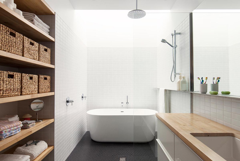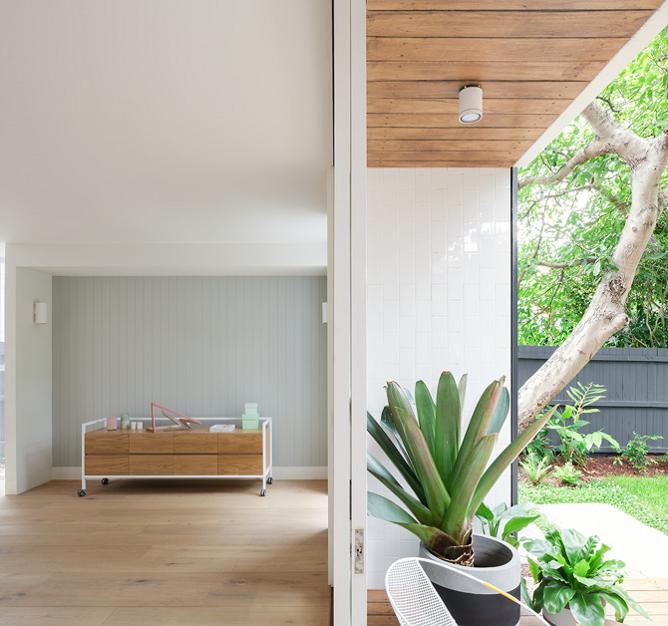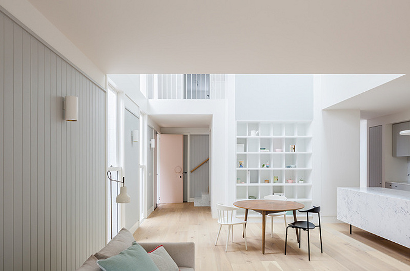 The face it presents to the street is quite stern. Box-like, no adornment, a little severe. The architects call it a “nod to the Victorian character of the street without any of the attendant frou frou.” Open the door and the mood changes. Although still minimalist there is a warmth conveyed but the lightest of pastel shades and the extensive use of wood. The small space is enhanced by furniture and fittings that stand on narrow legs allowing longer sight lines while a double height void opens up the room. I’d love to see how this house mellows over time as the new owners put their stamp on the clean contemporary lines. House in Double Bay by Sydney-based architectural studio Tribe.