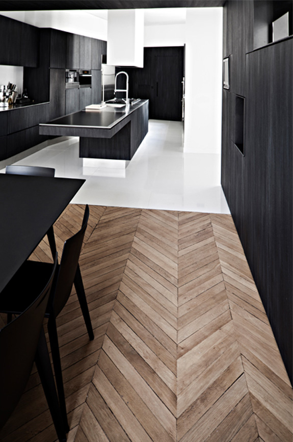 Is there a point in time when owning a home with chevron hardwood floors this breathtaking that you eventually stop staring at them with a stupid grin on your face? Doubt it. Parisian apartment again by REV Architecture.