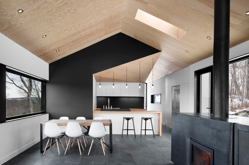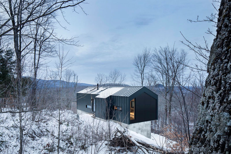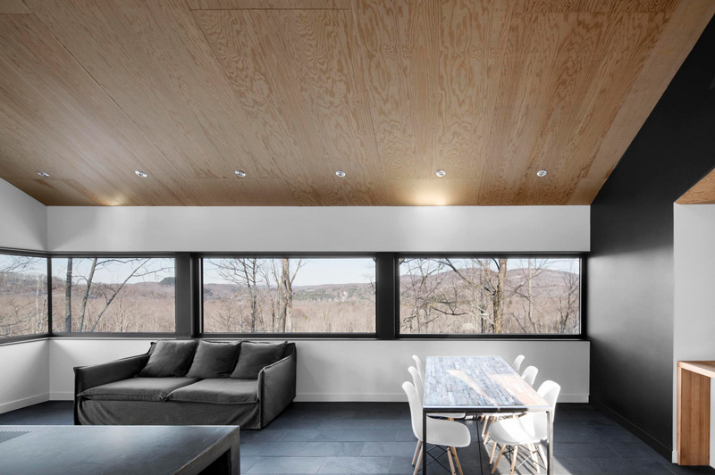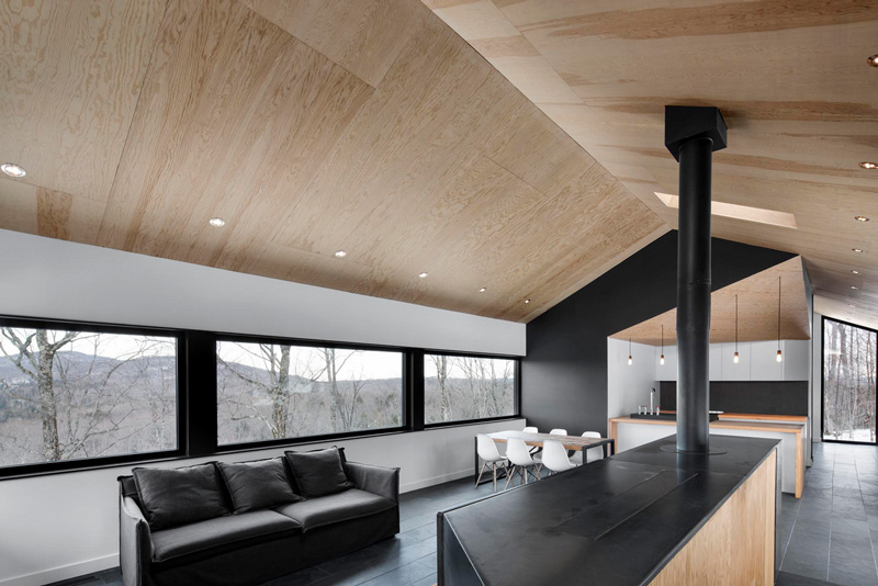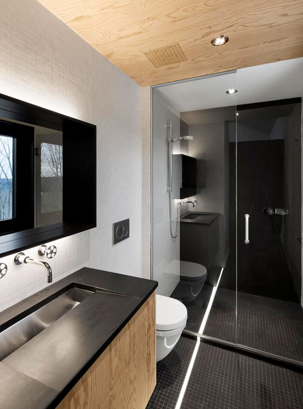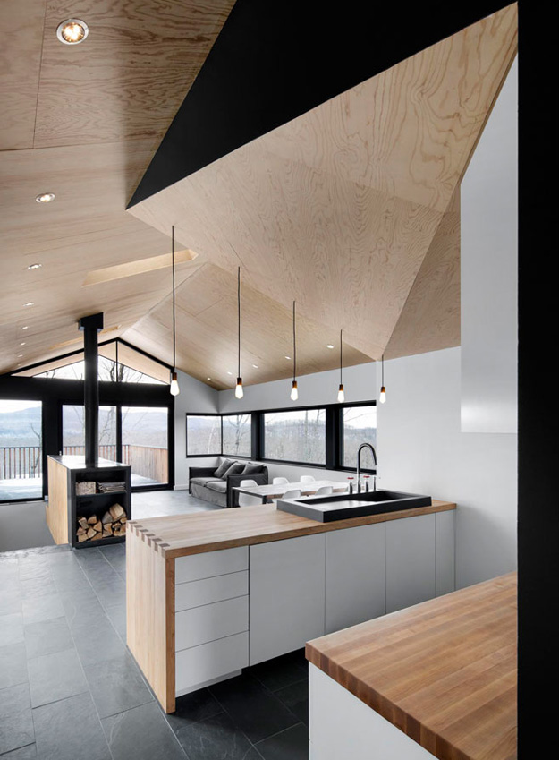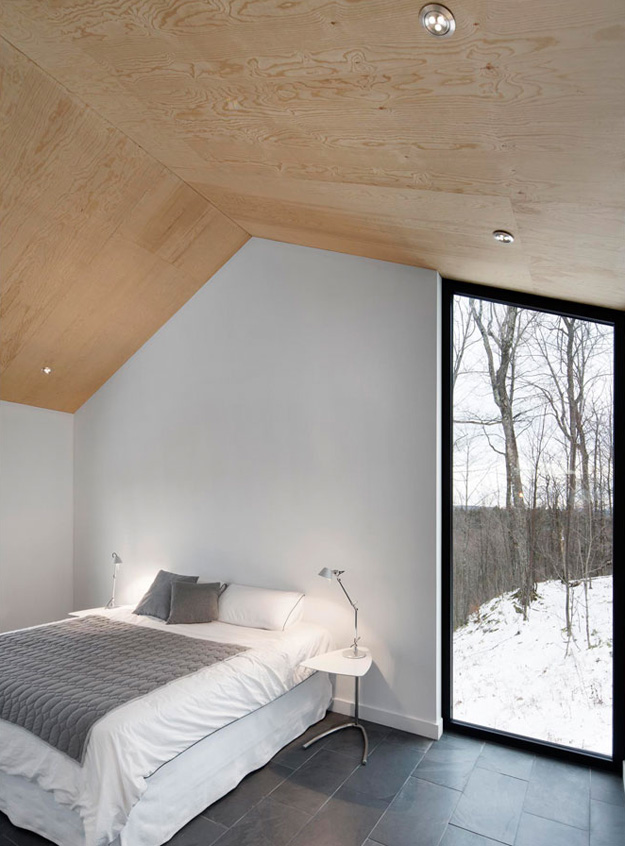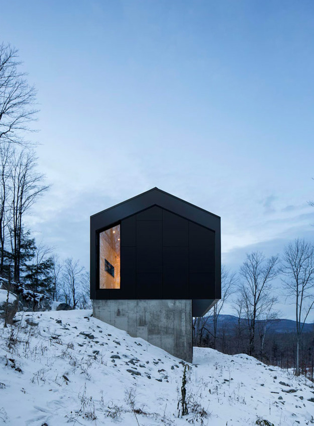 You know your friends would be bugging you constantly to spend boring winter weekends at your cabin if this was yours. And in the summer? Absolutely! Another perfectly executed home by _naturehumaine. Having bought a beautiful plot of wooded land in Quebec’s Eastern Townships, the client dreamt of building a country house that would be in perfect symbiosis with its natural environment. The house is characterized by two stacked volumes; a wooden clad volume anchored into the mountain supports a cantilevering ground floor volume above. This gable roofed volume raised into the air gives the sensation that the house is floating amongst the trees. Vast views of Mount Orford and the valley below are framed by a long horizontal strip window. The kitchen and master bathroom are carved out of a black volume at the center of the house dividing living spaces from the master bedroom.