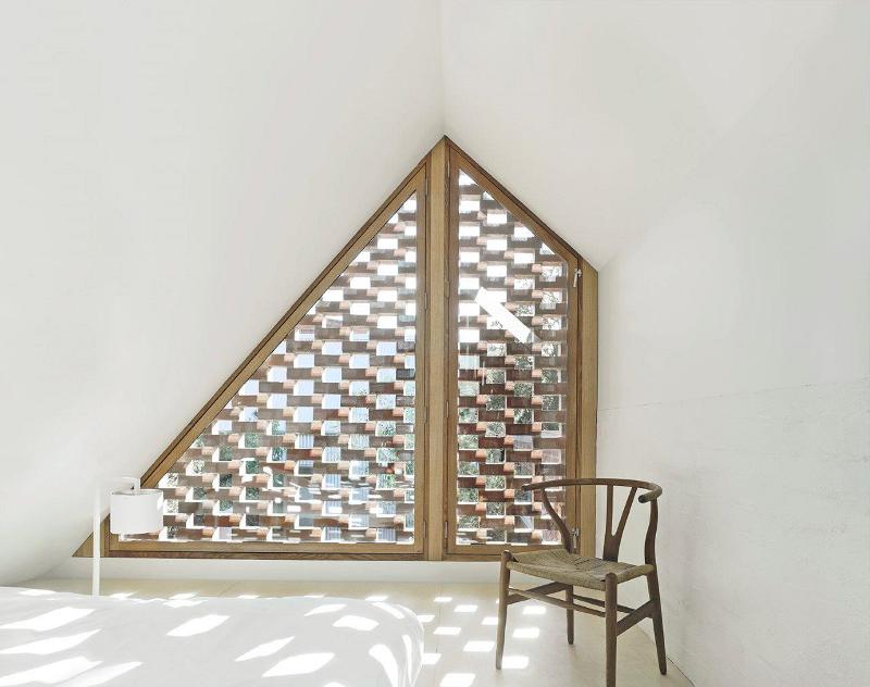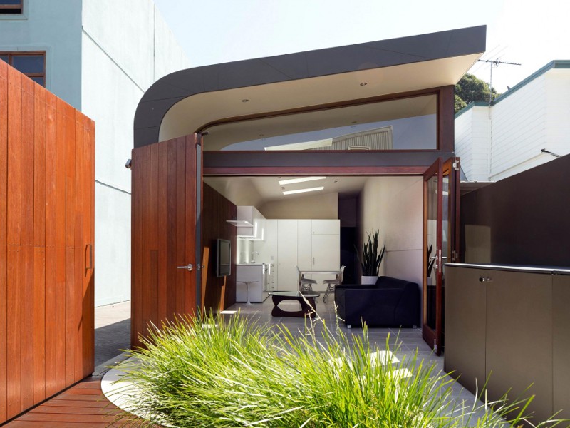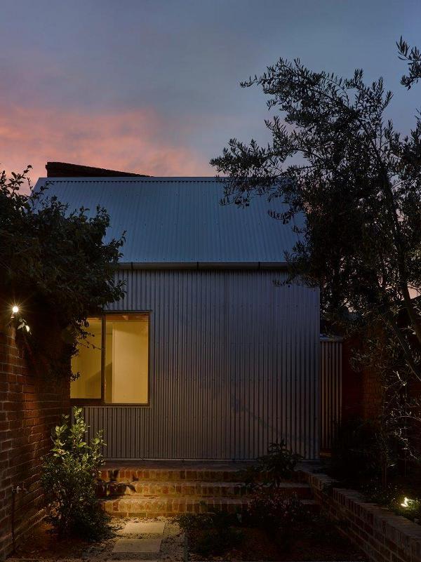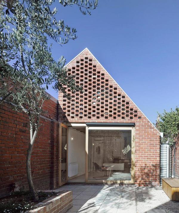 A gem of a small house extension and backyard studio. Light dances through brick lattice and skylights while the simple triangular volume provides living and sleeping space. Floating. Lightweight. Jewel House by Karen Abernathy Architects.