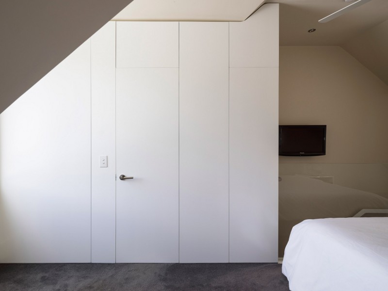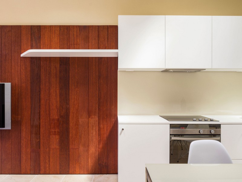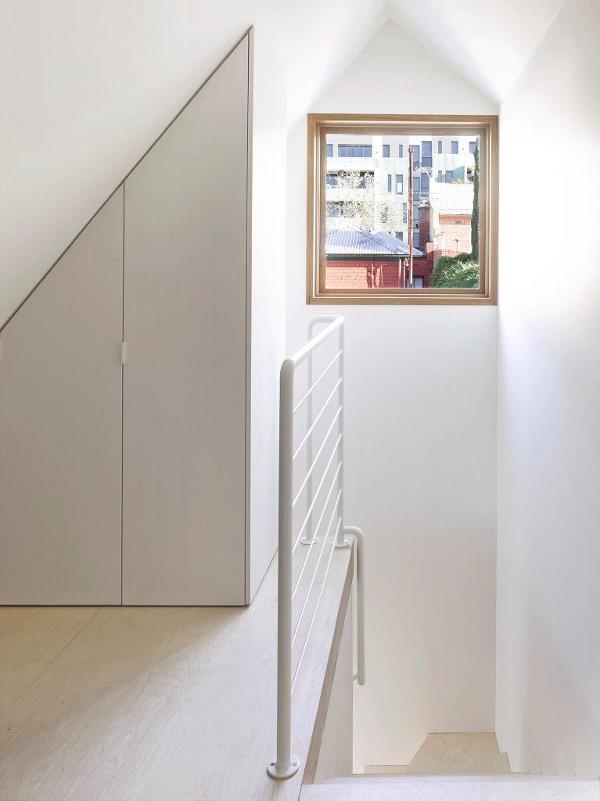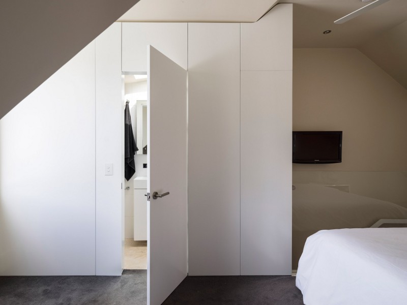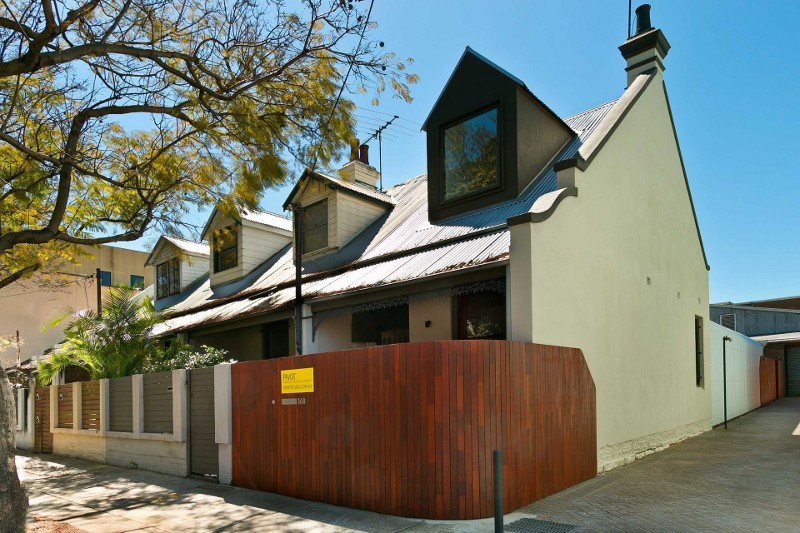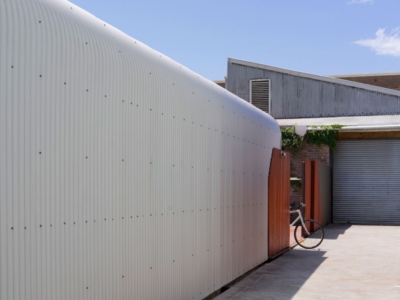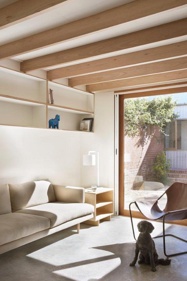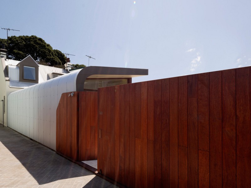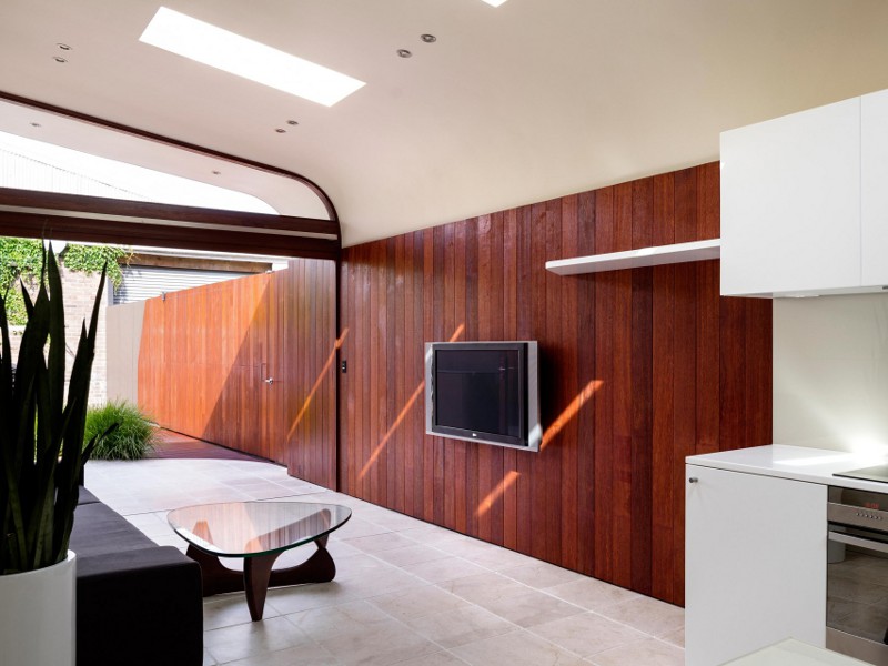 Referencing the industrial buildings around it and blurring the distinction between wall and ceiling this rear extension rebuild encompasses the space while allowing a seamless transition between inside and out. Alexandria House 1 by Sydney based Pivot.