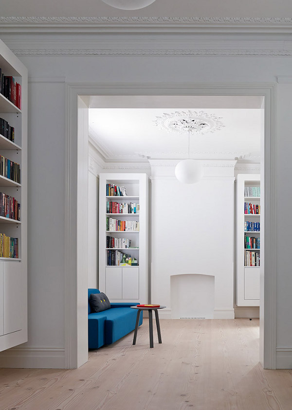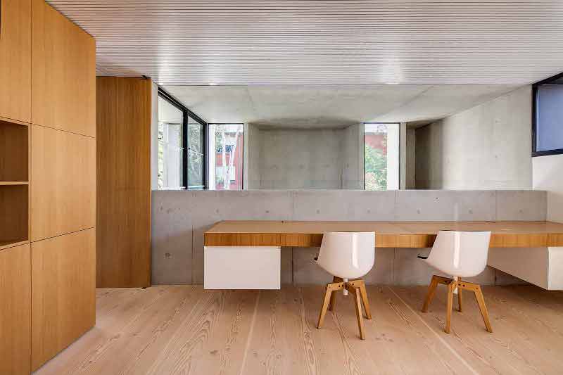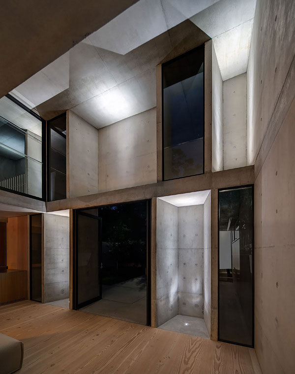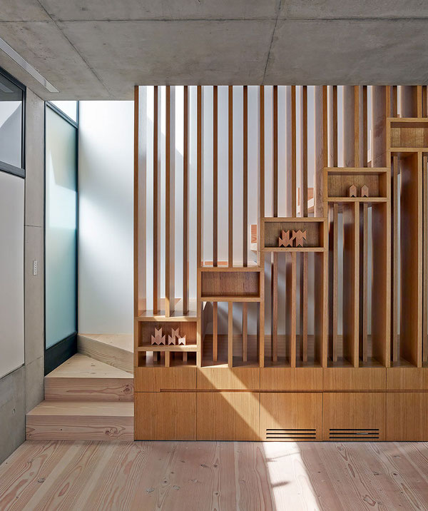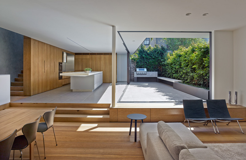 New against old. Blocks of concrete and narrow recessed glass. Outward and in and the relationship between the two. Open plan extension to a Victorian era house where the new contrasts against the old. Internal walls of concrete are warmed by wood. It’s a restrained palette of concrete, black aluminium, stainless steel and oak. Glebe House by Nobbs Radford Architects.