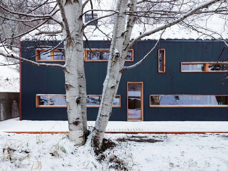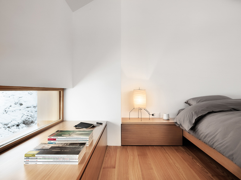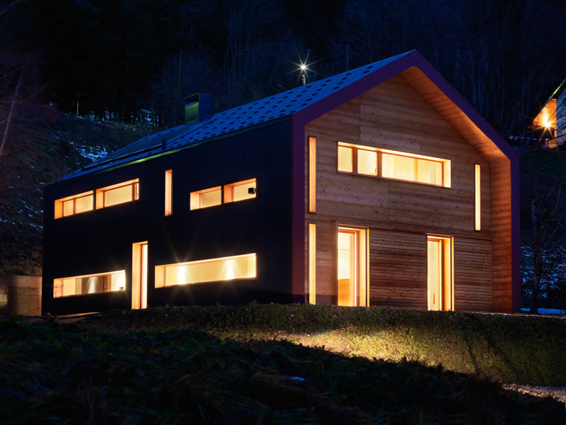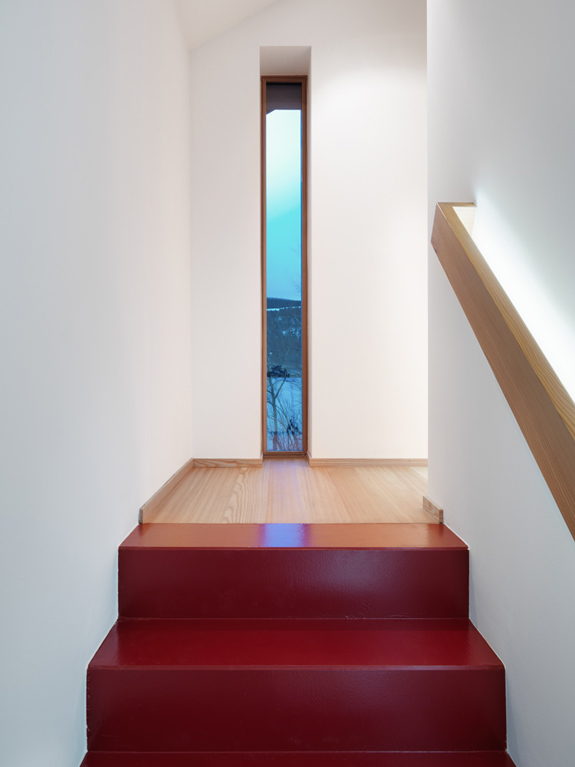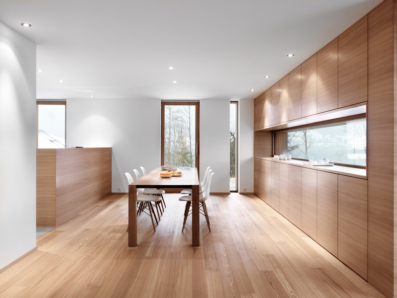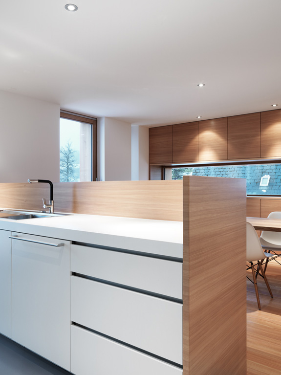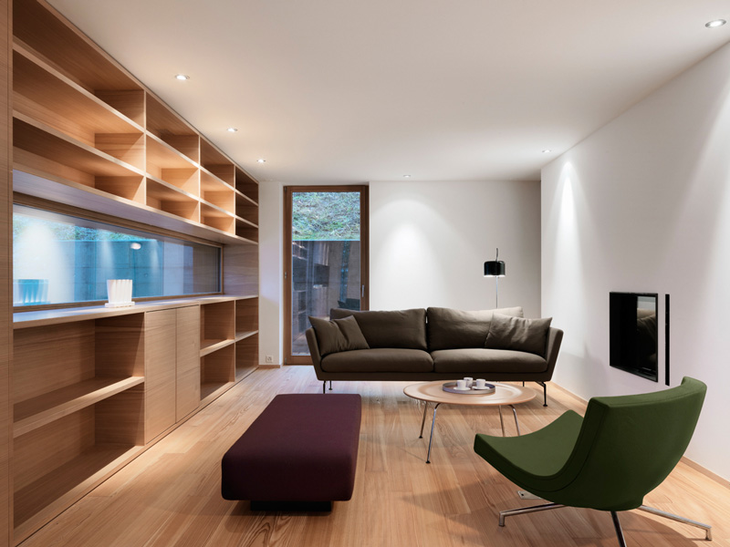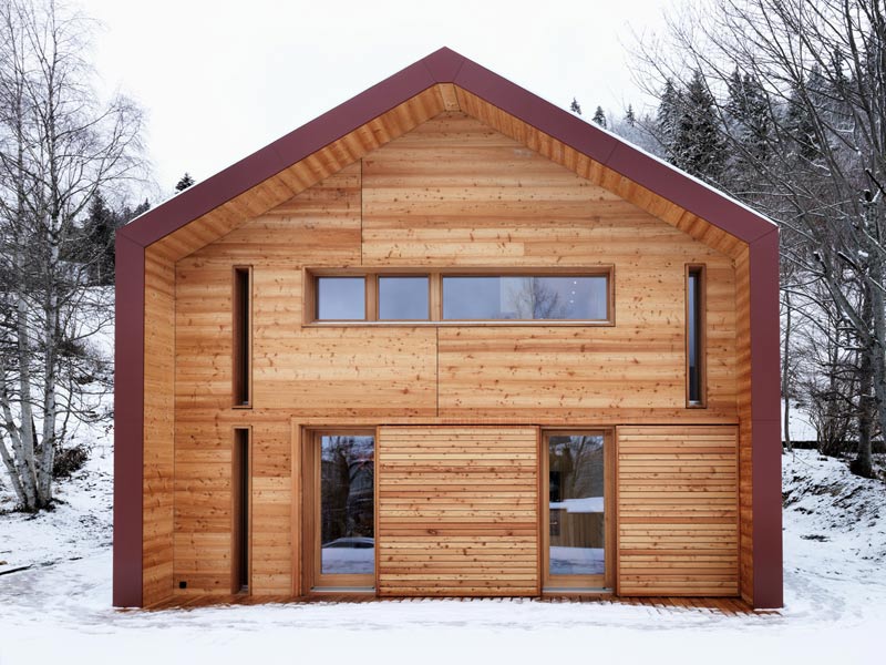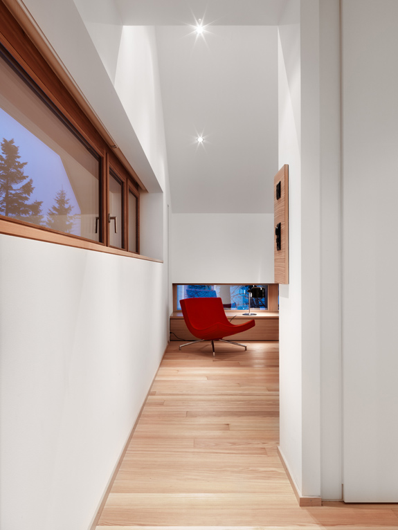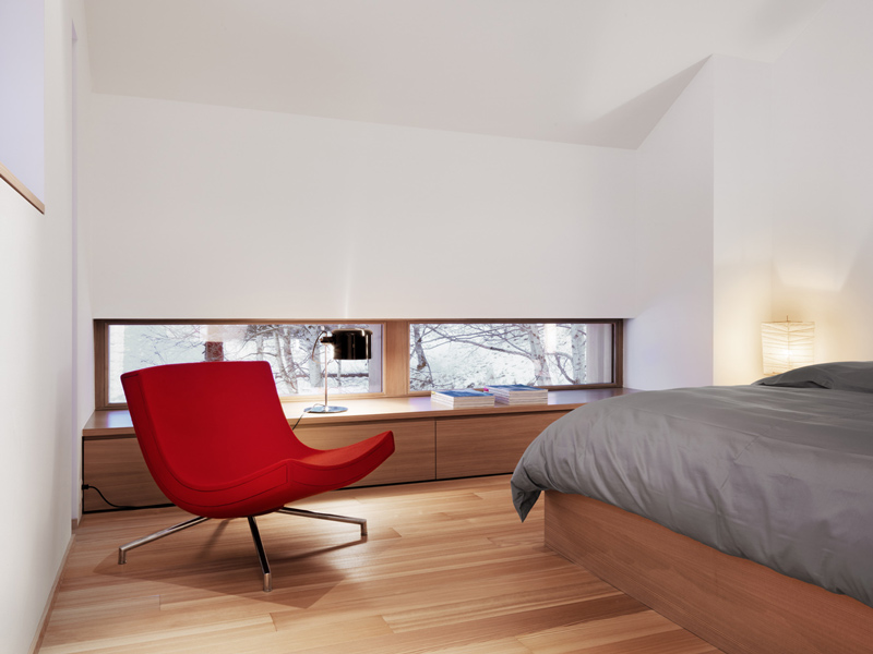 Here is another house designed by Swiss architect Ralph Germann that I received lots of big juicy photos of. This one like the one I blogged Friday is another take on a modern cabin so I’m totally smitten right off the bat. I have always been intrigued by homes with odd shaped windows placed unconventionally, and the windows in this home are just that. I love that some are low and horizontal (perfect in a bedroom so you have a great view from the bed), and others tall and narrow only providing a glimpse of the scenery beyond.