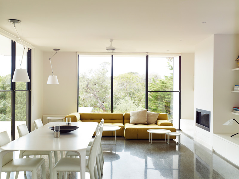 Nestled in a canopy of trees in the Dandenong Ranges, the Emerald House is the soul of discretion. Surrounded by thick foliage and tall maple and oak trees, the house dissolves into its landscape, creating an almost tree house-like atmosphere.