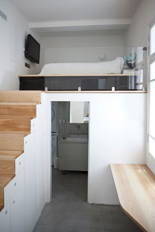 I love this minimalist loft apartment by designed by Chaira Ferrari Studio (especially the exposed brick, and the lighting by Chiara over the kitchen table). A former photographer’s studio by the Thames has been transformed into a minimal contemporary apartment with an element of its industrial past. The layout is centred around the spacious main corridor that ends in a high-ceilinged open plan living and dining area that offers uninterrupted views of the river. A master bedroom with en suite, two extra bedrooms, a bathroom and a study area are designed to maximize space. Existing features of the building have been revealed; the original brickwork offsets the modern elements, such as the smooth Corian kitchen worktop, which features a bespoke curved backsplash surface. (Photos by John Ross)