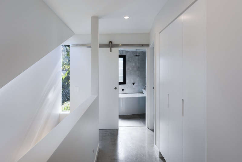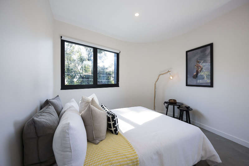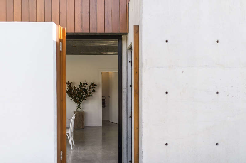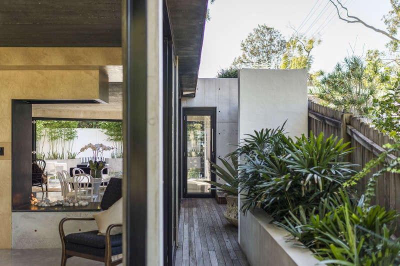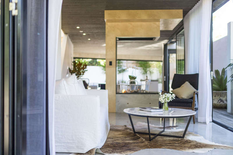 This 3 bedroom house in central Flinders in Victoria was designed for a young family by Wolveridge Architects. The simple clean lines of the facade are matched by the interiors where a series of rooms are connected to each other through cut out views and slat screens. Changes of level, up or down a few steps also delineate the simple spaces, while a central courtyard with fireplace provides a sheltered outdoor room. Understated and simply stylish.