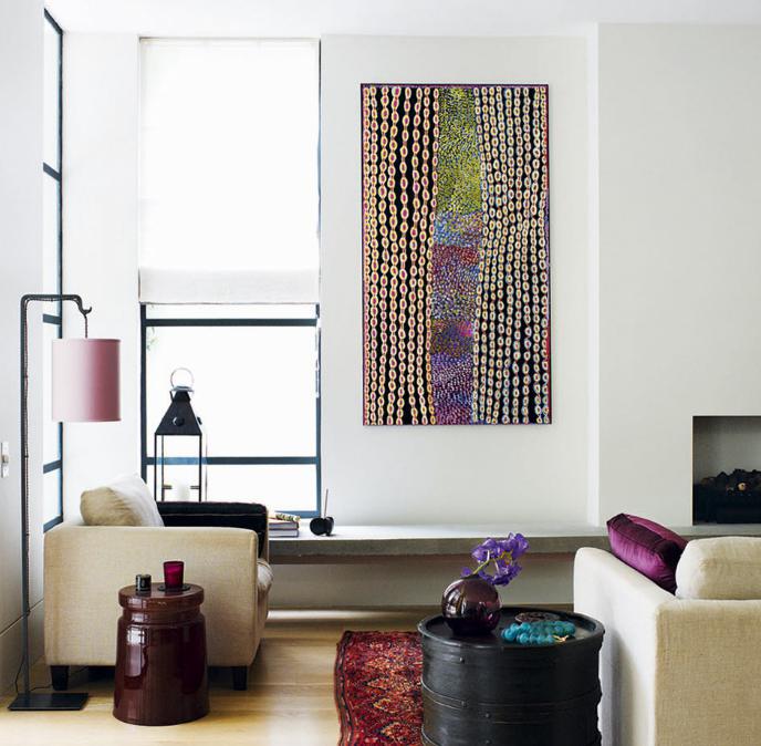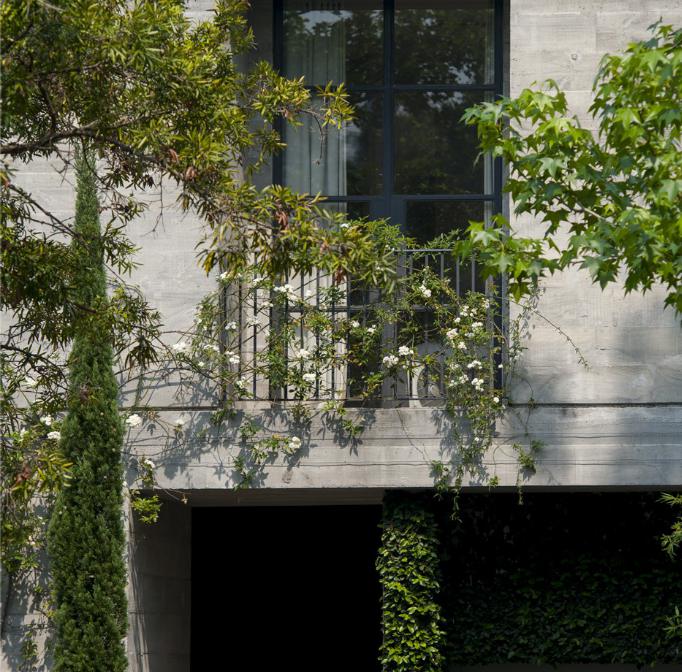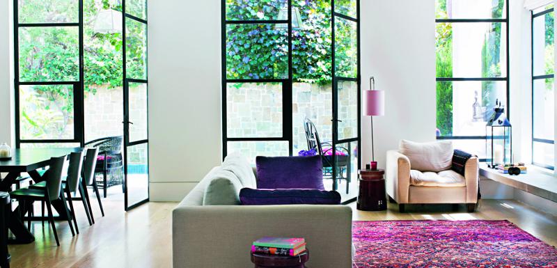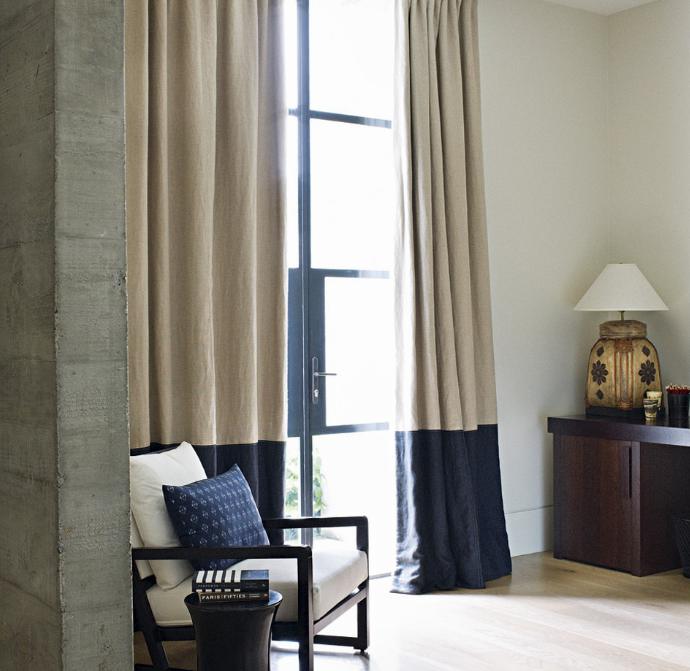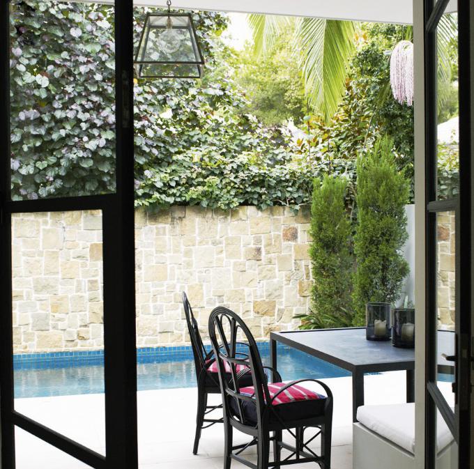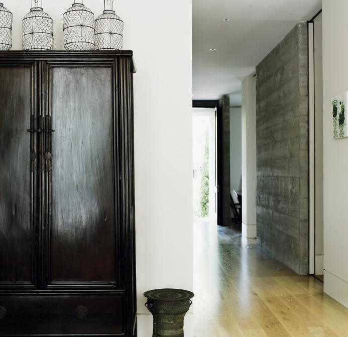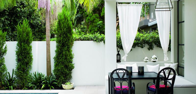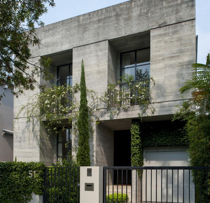 Hard edged sophistication softened by lush fabrics, texture on texture, rambling plantings. Light and air pour into double height spaces with tall doors and windows. No concrete bunker but rich and lush. H House by Bruce Stafford Architects.