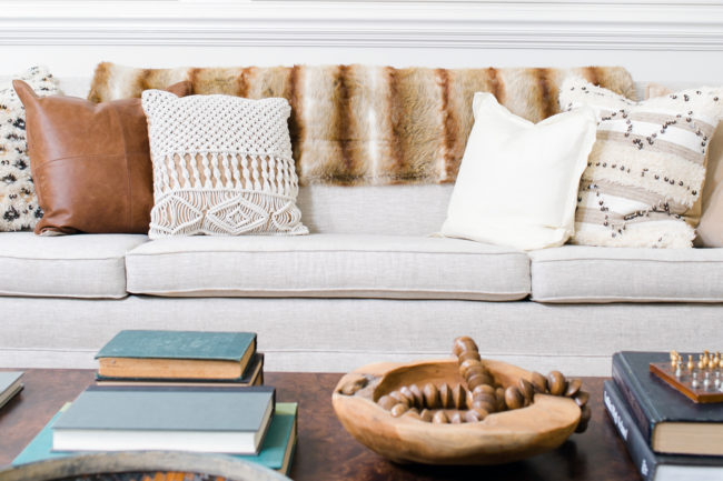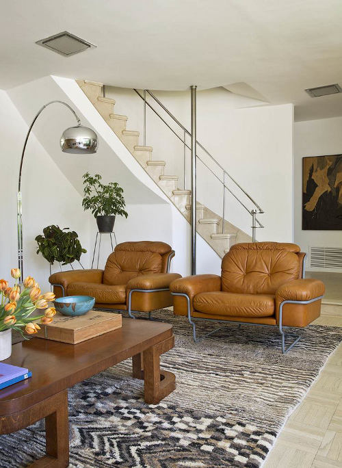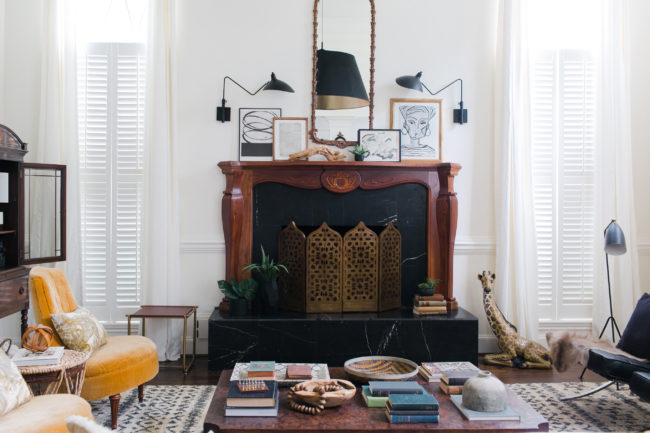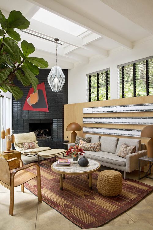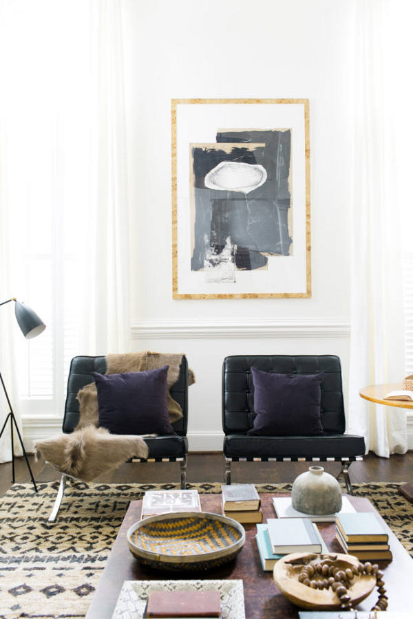 The layering of texture, the mix of modern and old, high-end and low, a colour palette of black and white warmed by rich caramels. Simply delicious. A classic, modern living room by Austin-based Claire Brody Designs.