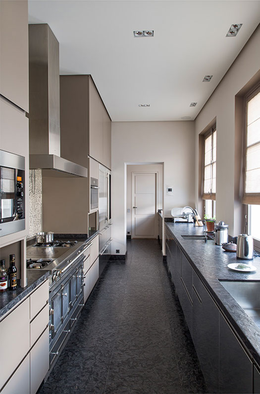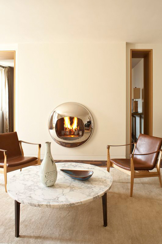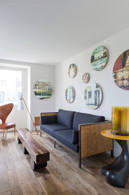 I adore this home of architect Nicolas Schuybroek that he renovated. It was a slum dwelling and with a minimal budget we’ve been able to renovate it from the ground floor all the way up. We’re standing in my office, which used to be a well-known gastronomic restaurant and back in the forties this space housed a butcher shop. The beautiful tiles on the wall remind us of that period. First, I was thinking of removing them because they aren’t in good condition. But now I’m glad I didn’t. The same goes for other decorative elements in the house, such as the fireplace, the moldings, the wooden doors and floors and the staircase. We really wanted to preserve the volumes and charm of the building, although its charm is largely defined by the collection of furniture. The classic style mixed with midcentury iconic lighting and furniture and neutral colour palette really do it for me. I could absolutely live here. For more fabulous photos of Nicolas’ home check out the very cool Coffeeklatch (featured with permission).