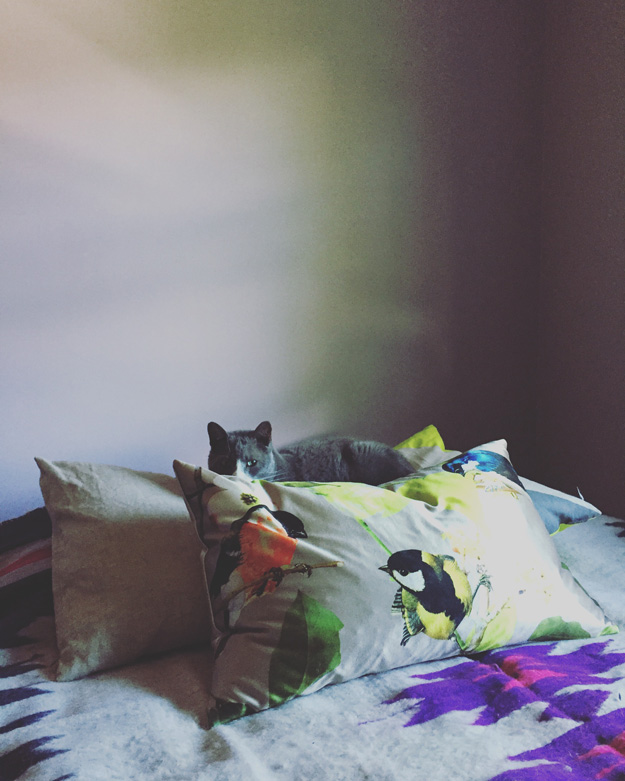 And some from me. Where a couple of chairs and the guest bed have become favourite hangouts. 1 – Mimin loves my Green Light District leather lounge chair (covered in Homesense sheepskin). 2 – So does Phoebe. 3 – Lucky is a fan of the vintage Plycraft chair (from Wiseman + Cromwell). 4 – (Former) feral brothers Bernie and Frankie lounging on the guest bed covered in a wool rug I brought back from my last trip to Puerto Vallarta. 5 – Felix enjoying the same bed but prefers the pillows for added comfort.