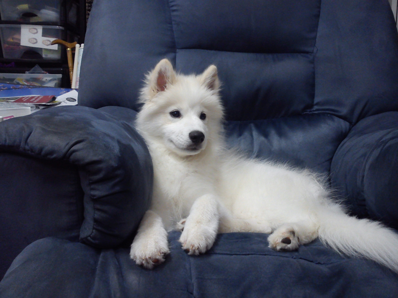 This is my beautiful little girl Amy (5mth old Samoyed/Husky cross) – she isn’t allowed on the regular furniture much (if at all) – but sometimes we catch her snuggling up on this particular chair to watch TV! (she especially loves Dora the Explorer and Escape to the Country (UK version).