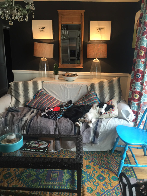 This is Rhody our sweet border collie puppy. So much for “no dogs on the couch” rule. This couch is a favorite nap spot for both our dogs, right off the kitchen it’s in the hub of our home so he can nap but not miss anything!
