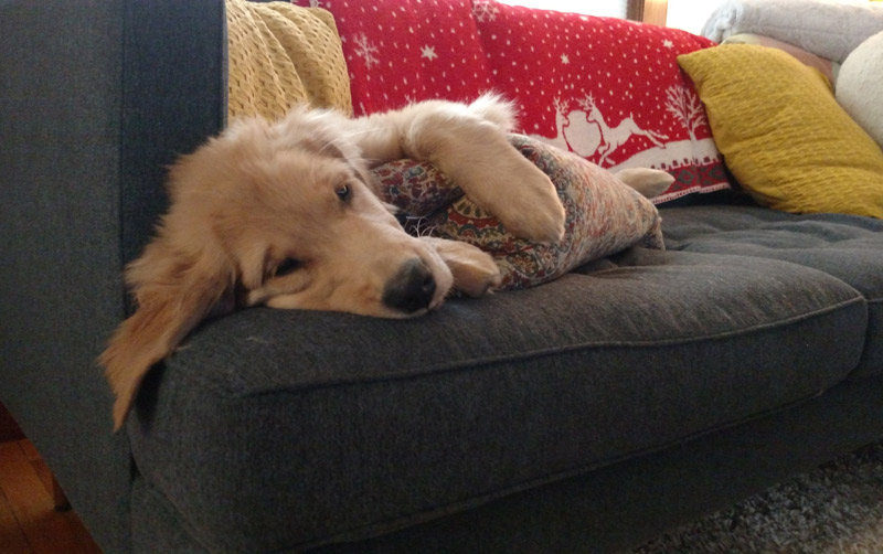 The genius of a Noguchi coffee table: a Golden Doodle see-through display of Sam. Eames daybed keeps Sam’s head well out of the sunlight.