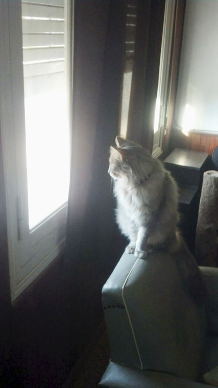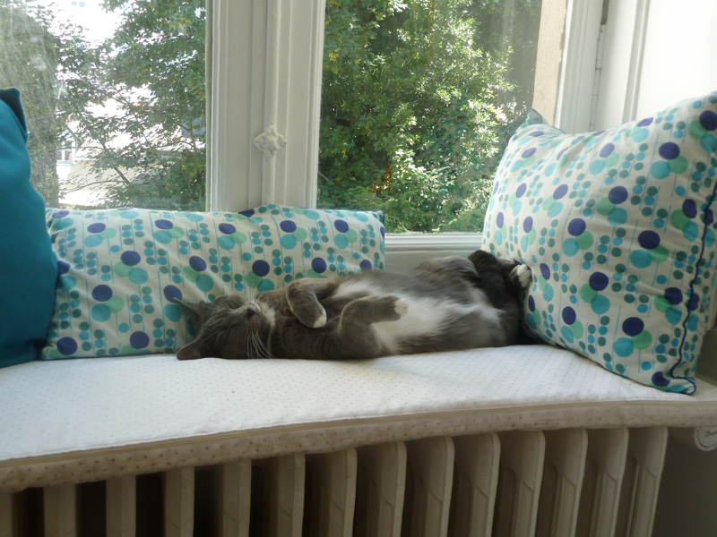 This is our beloved Myrtille enjoying one of her favorite places in the apartment : our daughter’s reading nook ;^).