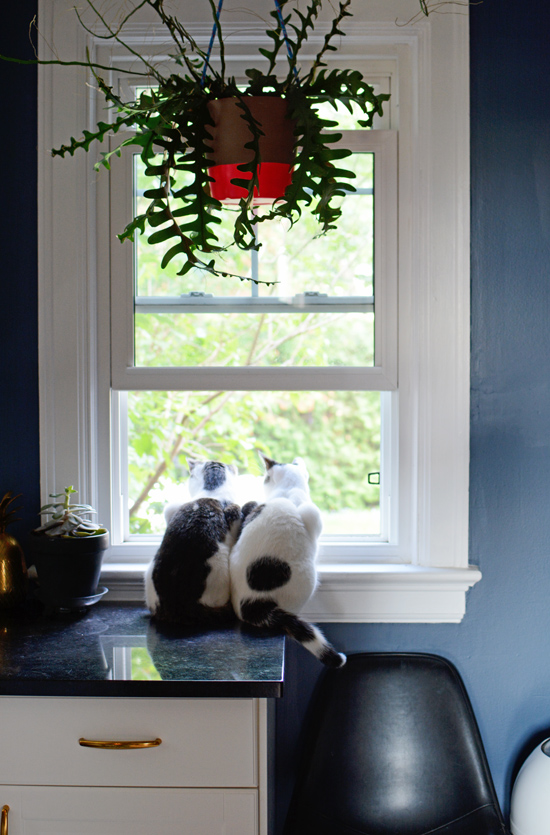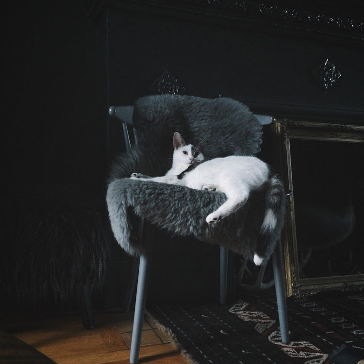 And a couple from my zoo. First, the 2 feral brothers Bernie and Frankie hanging out in everyone’s favourite window – which means I always have cats on my kitchen counters 🙁 And Frankie lounging on my J104 Hay Denmark chair in the living room (topped with a Homesense $30 faux sheepskin)