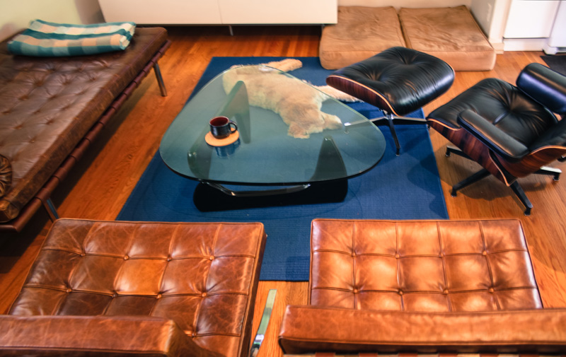 This is my view from my workspace: Sam The Goldendoodle zonked out under the Noguchi and surrounded by replicas of Eames Lounge Chair and Barcelona chairs & bench.