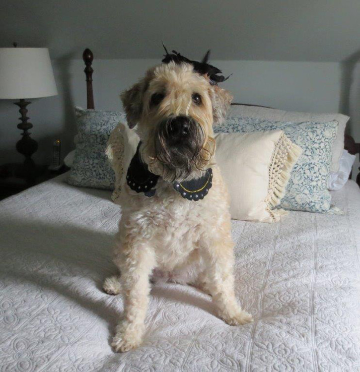 Here is a picture of my Soft-Coated Wheaten Terrier – Miss Darcy – in her New Year’s Eve outfit sitting on our 4 poster mahogany bed. The collar lasted all evening but the “Fascinator” only made it to 30 seconds before it was gone!