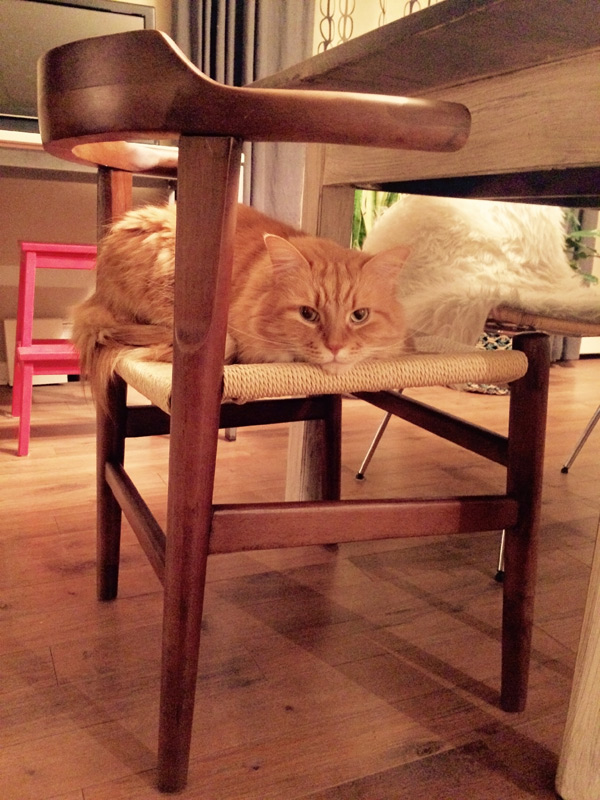 Here is my 7 year old rescue cat Tang lounging on his favourite chair – a wishbone reproduction.