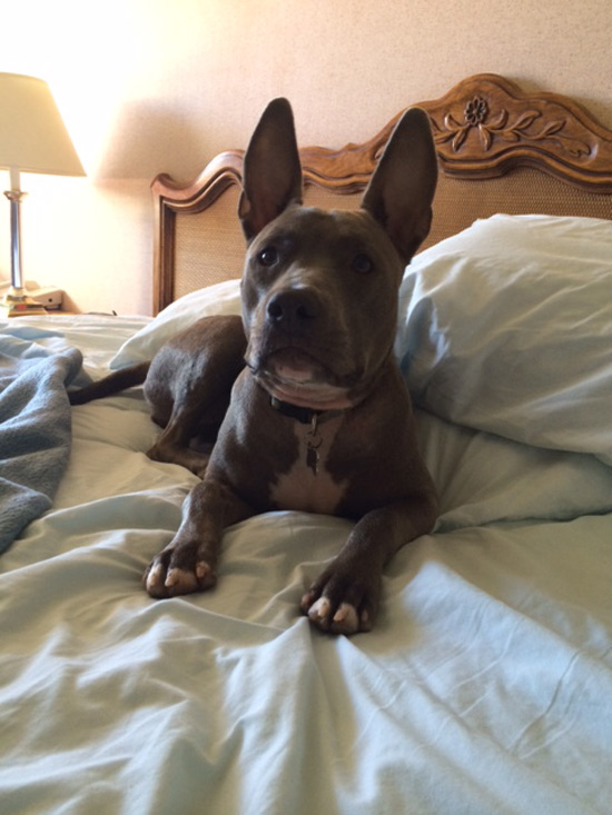 This is Flynn sleeping on my (HIS) bed. We spoil him ridiculously because he had a hard start to life, being tied to an abandoned rental property. We’ve gone through so much with him, including when he chewed the legs of an antique table and when he destroyed brand new, never-worn shoes. He is getting much better, but he still has a trick up his paw every now and then. Can’t imagine life without him!