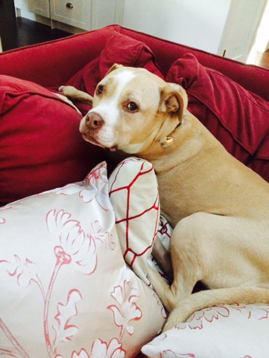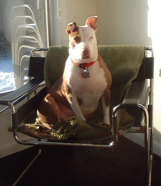 Here’s the lovely late Cyla on her (and my) favourite chair. After a very hard life, this lovely one-eyed pit bull had three divine final years surrounded by love and fine design 🙂