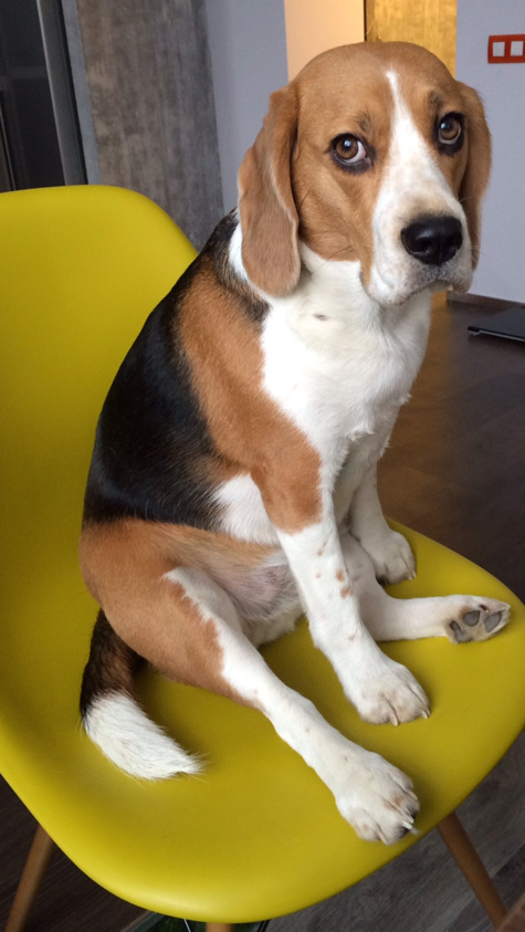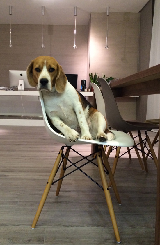 Here are a couple of pictures of our beloved 2-year-old beagle puppy named Glasha. She is a big fan of Eames side chairs! 🙂