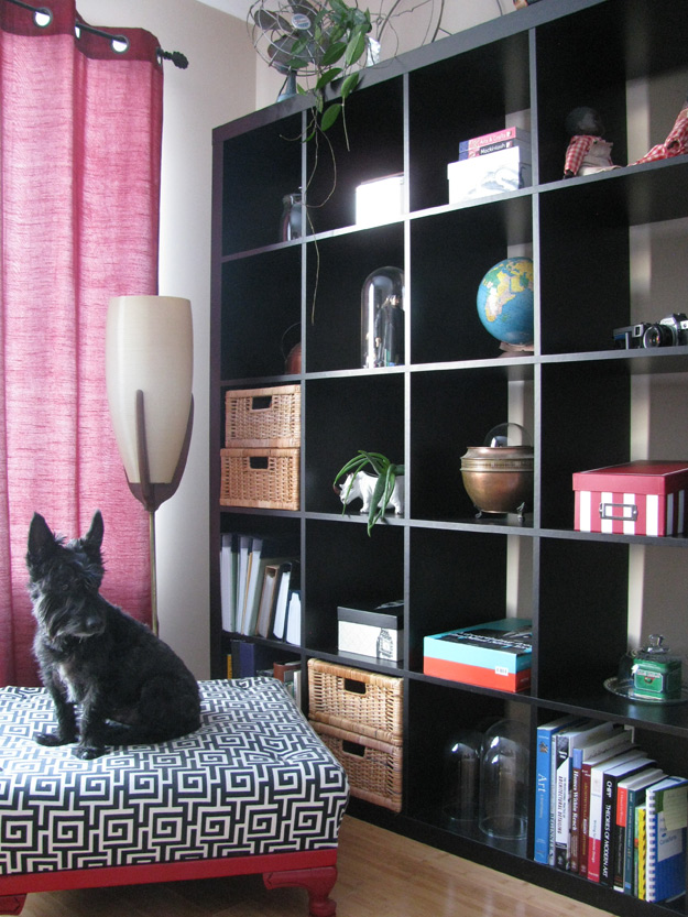 This is a photo of our Scottie, Greyson on a refurbished ottoman. Any piece of furniture close to a window tends to be his favorite place to watch for evil squirrels. He’s our wee hero.