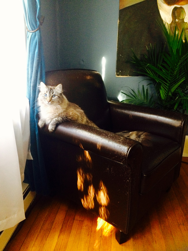 I snapped this photo with my phone last week while I was taking a break from the sofa (I was really sick for about 8 days straight). My spot was taken in merely minutes – by Milo, Felix and Mimin along the back. Best seat in the house I guess, especially when I warmed it up for them.