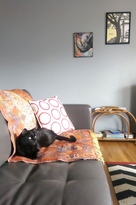 I look forward to this feature every week and while I didn’t have a chance to send photos of our last cat (RIP), I’m happy to submit a couple of pics of our new kitty, adopted from the local shelter about a month ago. She’s settling in beautifully. In these two photos, Princess Miu Miu is lounging on our Gus Modern sofa, keeping my husband company in his home office.