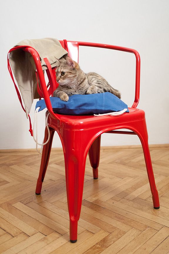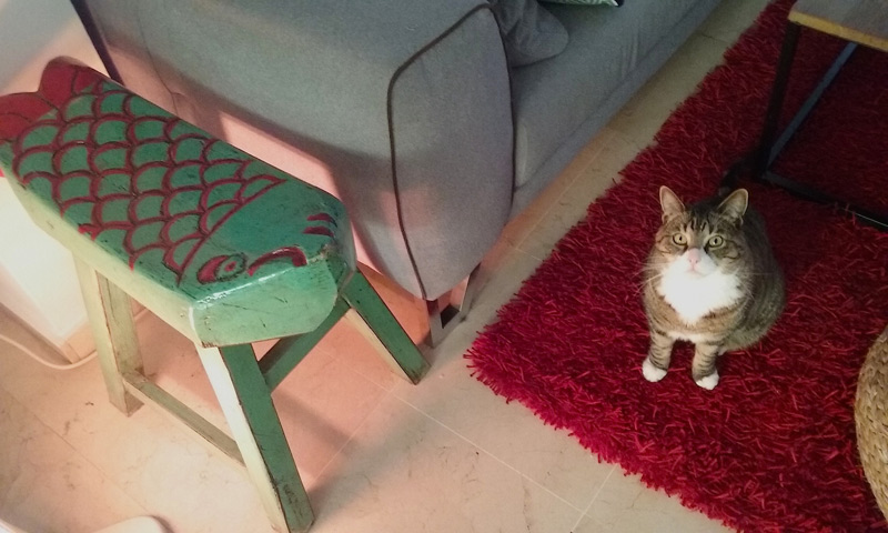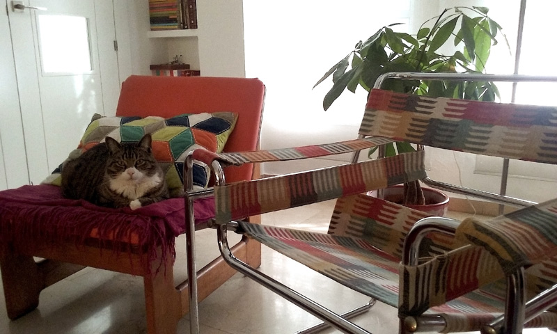 I’m sending you two photos with my cat named L’Oficial. In the first one, he is sitting on an old 60s armchair and beside there’s one recycled Marcel Breuer recovered with a coloured clothing. In the second one, he’s beside an oriental fish-shaped bench (I don’t know exactly where it’s from).