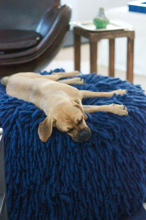Our puggle Hektor loves to visit my parents’ house. Not only do they live 10 mins from the beach– providing ample opportunity for running around like a maniac, digging to the center of the earth and eating seaweed– their living room features this uber comfy Shag Pouf from Calypso Home. (Shown in Navy in front of Restoration Hardware’s 1950s Leather Copenhagen Chair.) As you can see, Hektor has come to think of it as his personal pouf.