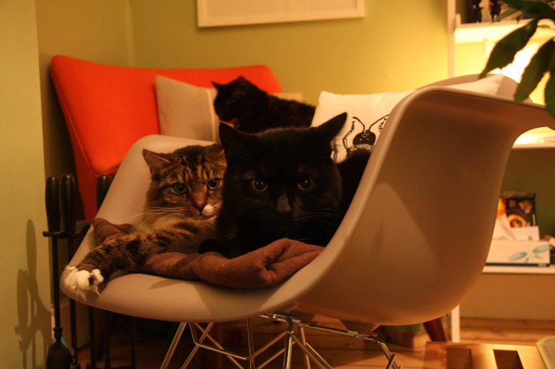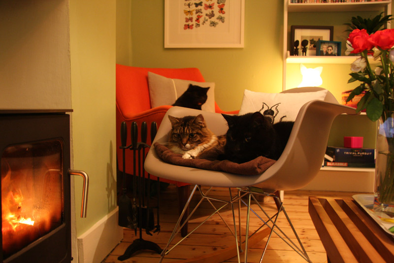 Noah and MegaCat are pleased that the arrival of fall means that the wood burner is getting used, MegaCat has made the Eames rocker his own but this evening he kindly shoved up so that Noah could join him by the fire warmth.
