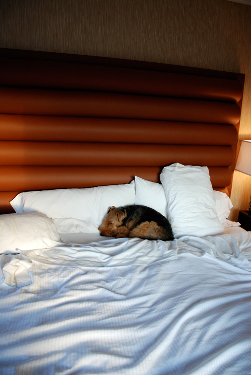My buddy Miles loves to travel with me and truly appreciates dog-friendly hotels with style. Here he is taking a nap in a boutique-style Westin hotel room.
