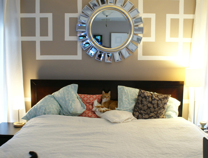 This is OJ on our master bed, making himself comfy on the pillows (my mom sewed the cases). If you look closely, you can spot his brother’s tail in the photo, too.