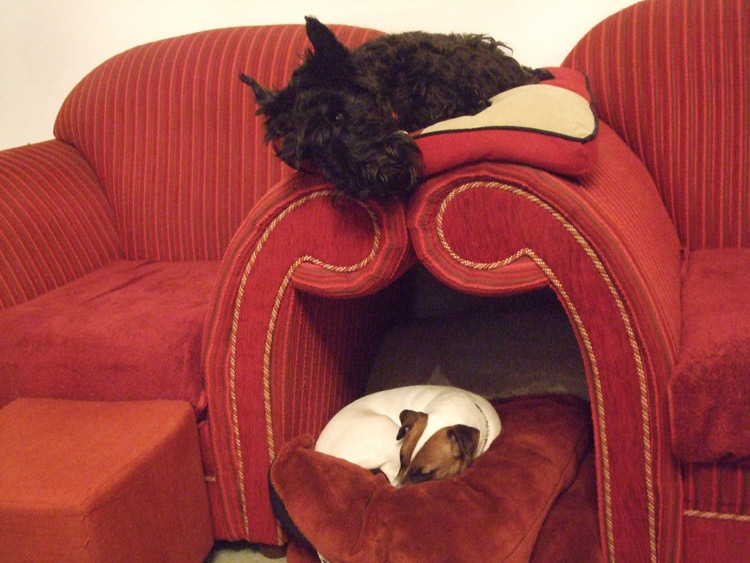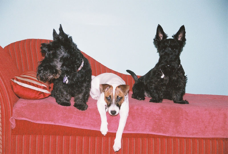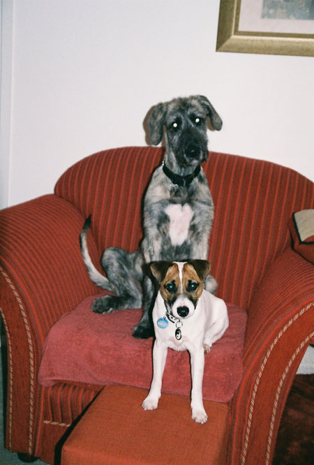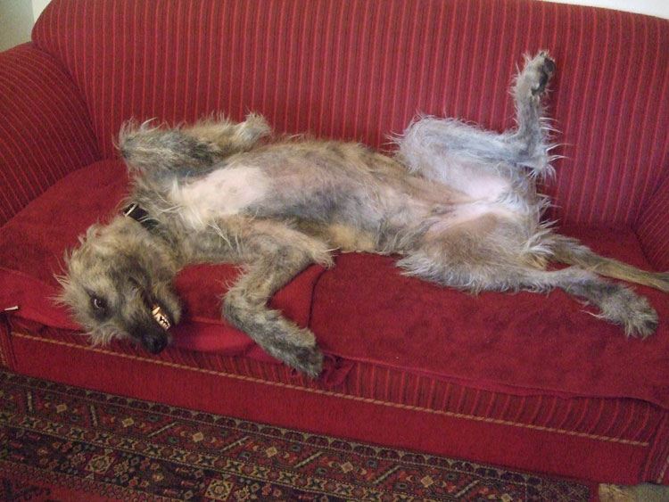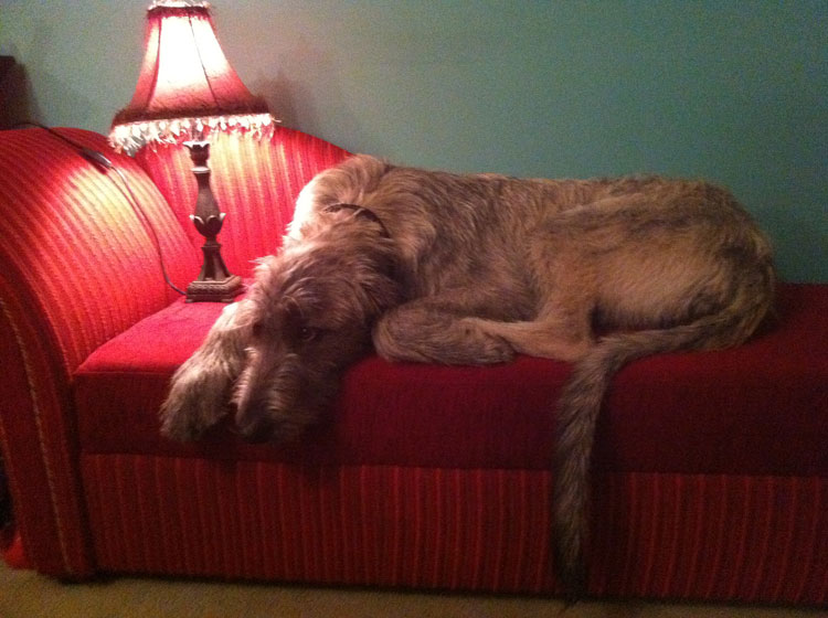 Attached are photos of Galahad the Irish Wolfhound, age 1, lounging on our chaise or couch. A lovable comedian that loves his creature comforts. He makes any piece of furniture look like it should be in a castle! Attached are photos of my dogs lounging on our chaise or couch. A lovable bunch of comediennes that love their home comforts. Galahad the Irish Wolfhound, age 1. Uther the Jack Russell, age 1. Merlin the Scottish Terrier, age 13. Maab the Scottish Terrier, age 2. Roger the Corgi x Heeler, age 4.