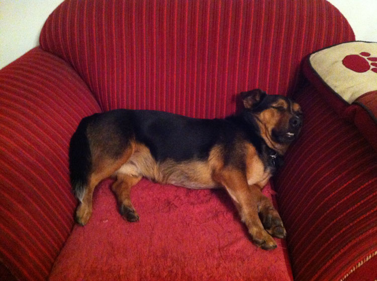 This is Rosco, a one year old dachshund sleeping on the couch.
