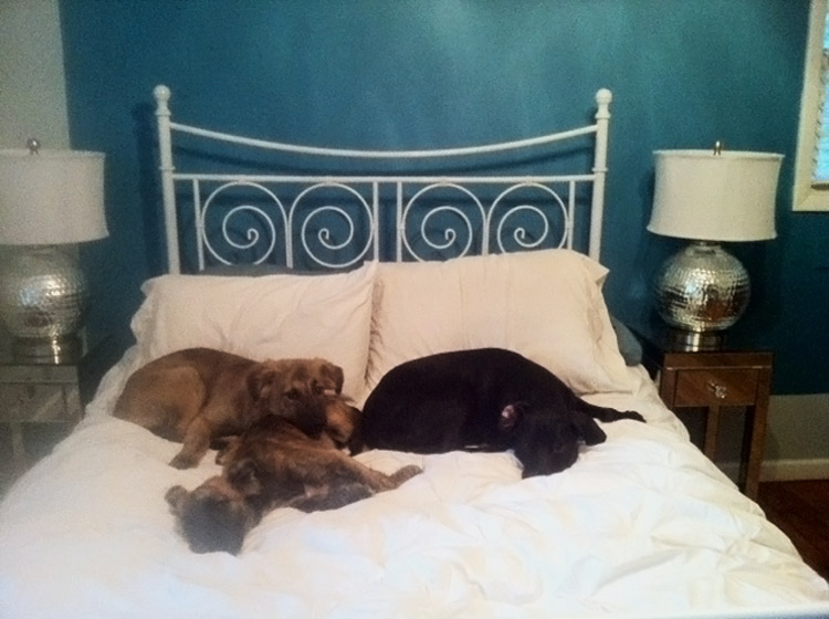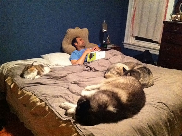 the bf, carl kitty, and ting and hazel(the huskies); proof the dark blue bedroom paint is restful.