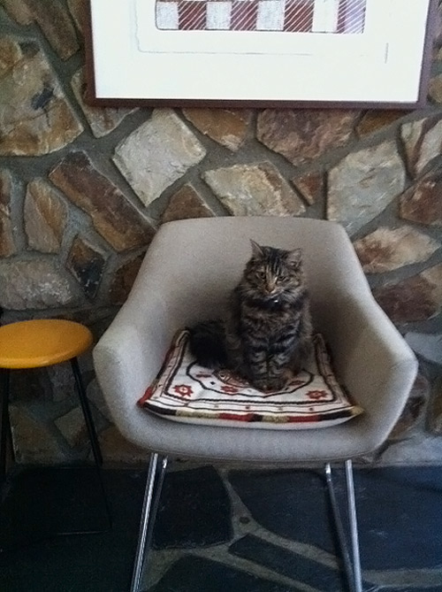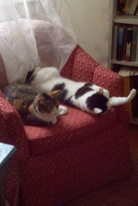 Here are Pico and Julie lounging on a recently reupholstered living room chair. Pico (black and white) can be quite a bully so it’s nice to see them enjoying each other’s company!