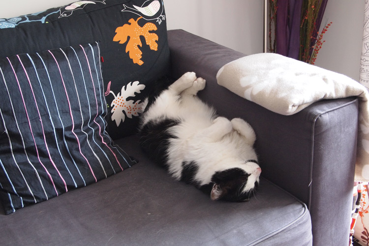 Here is Cukierek (“Candy”) our enormous cat resting in his favourite place on our Ikea Manstad sofa. Sometimes he looks just like another pillow…