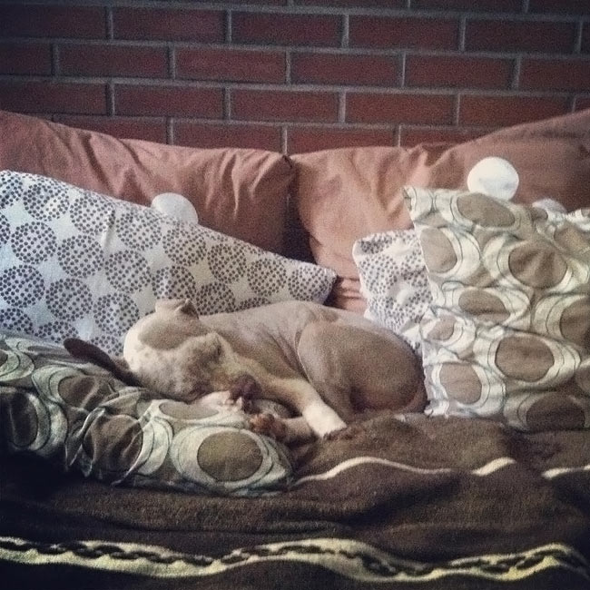 These are my pets, Spaz (cat) and Idgie (dog). Spaz is 13 and is Idgie is 10 months. We live in Fort Worth, TX. Spaz is featured on my vintage dining booth. The second photo is a lazy Sunday spent on the couch, a rare moment of peace :).