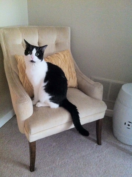 Here are some pictures of my cat Sammich on a loveseat my mom reupholstered for me in my favorite pattern, houndstooth.