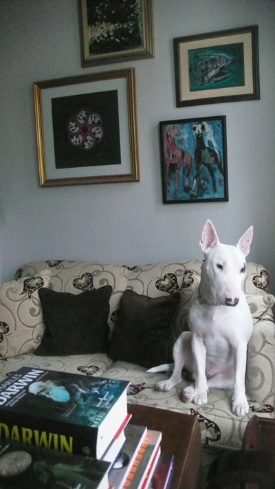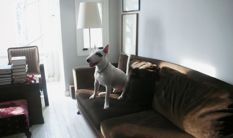 1 – We are living at home with two cats and one dog at Bosphorus İstanbul. Here is a photo of our English Bull Terrier. His name is Kafa, in good boy position on our George Smith sofa.