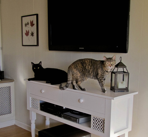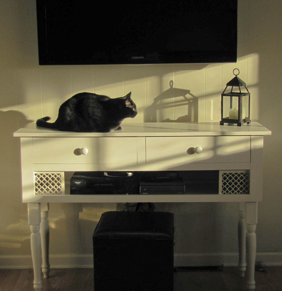 The first picture features a media console I built and was trying to photograph (sans kitties) for my blog. The divas, Lily and Stinkerbelle, would not stay off the console. They live for a good photo op…The second one is of Lily soaking up some rays on the same console.