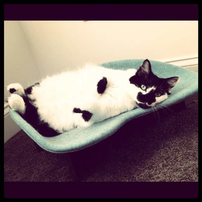 This picture is of one of my cats, Moo Moo. She loves lounging on her retro cat bed (etsy) as well as our furniture. She always hops right in and claims her spot!