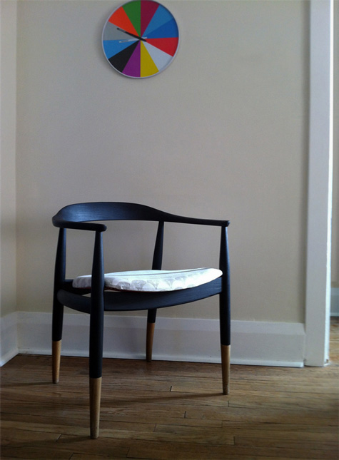 Leroy is obsessed with the birds outside so I usually find him hear making chirping sounds. Chair is thrifted Modern Danish and covered in sheepskin. Pillow is a local silkscreener that makes cityscapes of our fair city.