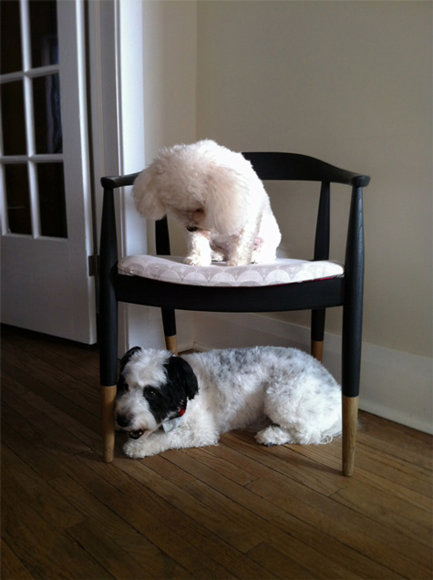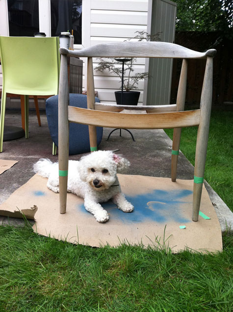 These are our dogs, Leela (top) and Bailey (bottom) sitting with our recently finished DIY project, a mid-century modern chair we picked up of the side of the road. I’ve also included a photo of the ‘before’ state of the chair. Leela had meandered under it for a rest the day we were working on it in the backyard this passed summer.