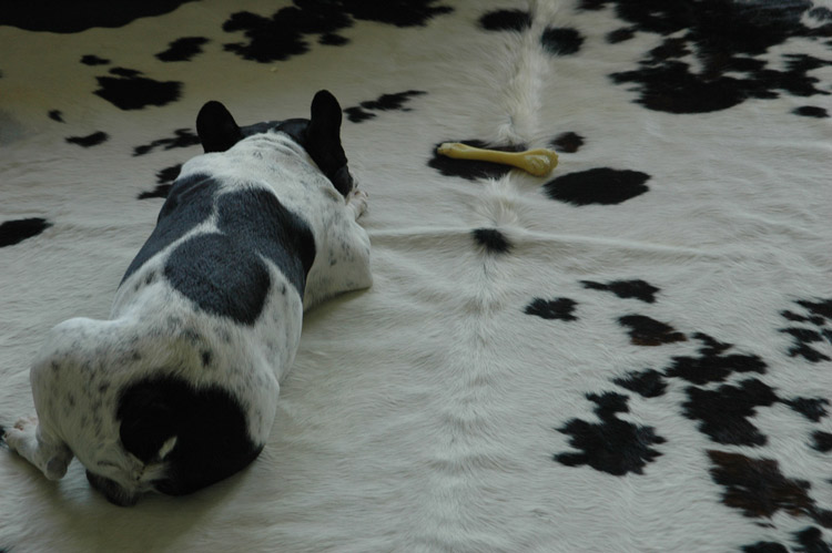 Enclosed a picture of Diesel, my 6 year old French Bulldog, on a cowhide (I know, not really furniture but I had to try…) and on the couch. His favorite things to do are sleeping and staring out the window.